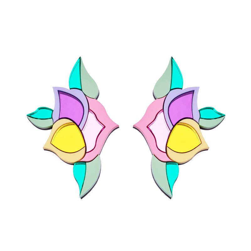 Material: Metacrilato verde espejo, verde pastel, lila pastel, morado espejo, rosa pastel, rosa espejo, amarillo pastel, amarillo espejo, base en negro.