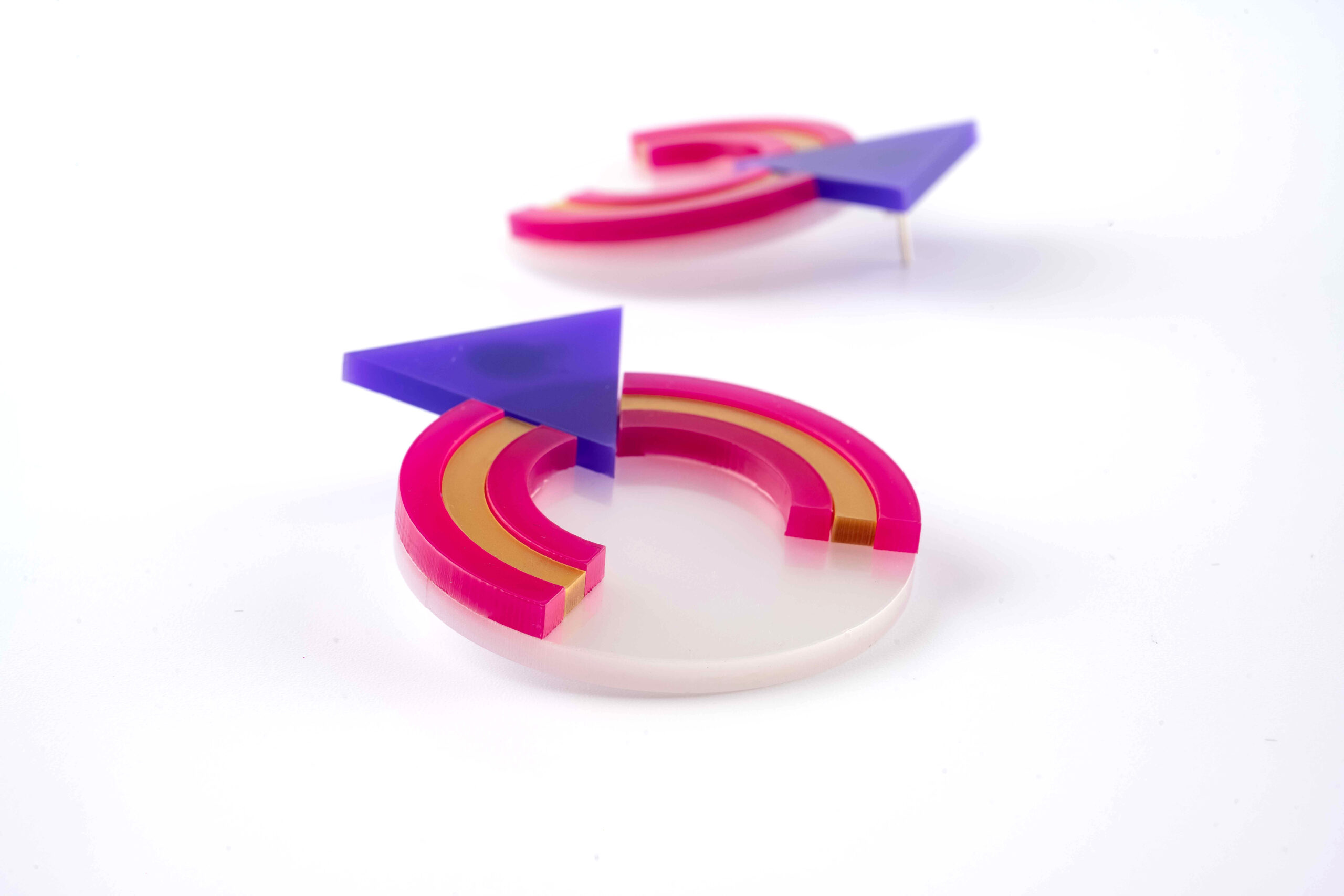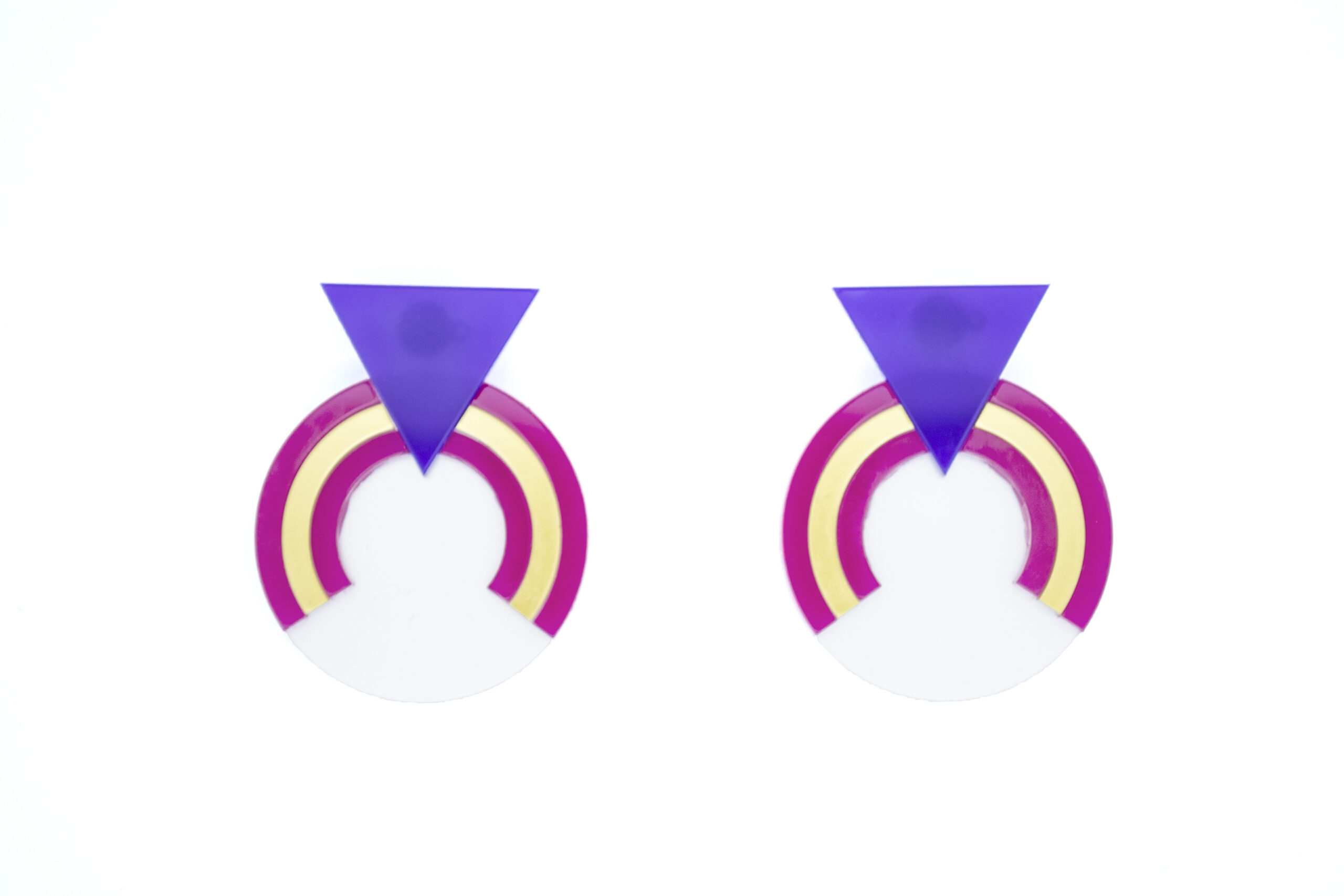Material: Metacrilato blanco perla, morado, fucsia y oro opaco.
